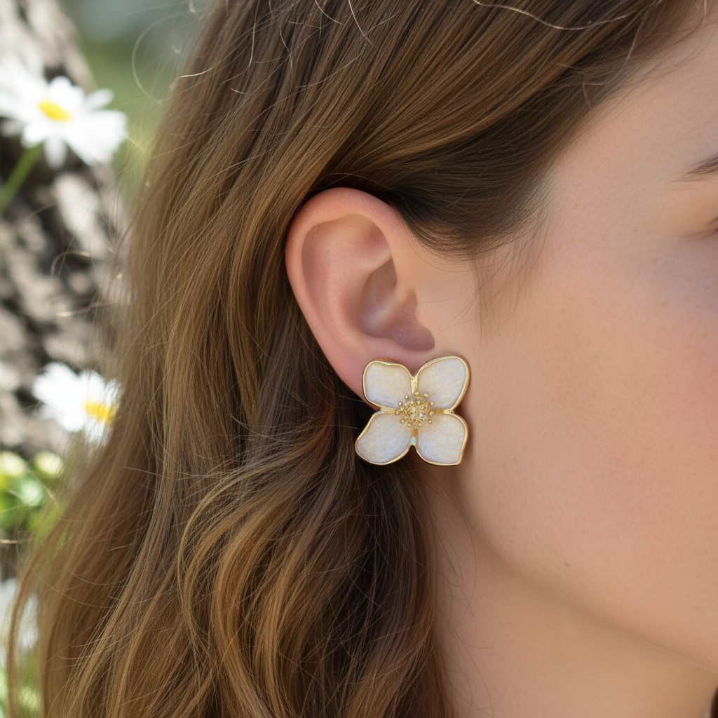 Faites éclore votre éclat naturel avec Emna, des boucles d’oreilles en forme de fleur nacrée au charme doux et lumineux. Leur finition irisée, bordée de doré, rappelle la délicatesse d’un pétale caressé par le soleil ✨.